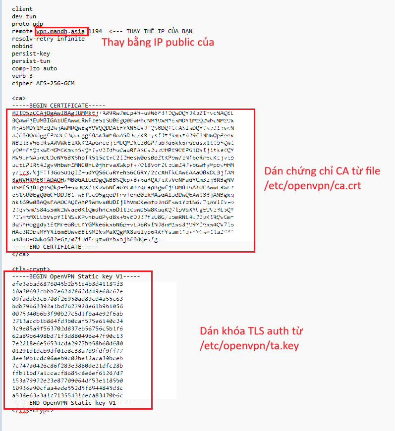 • Chèn Khóa TLS Auth: Dán toàn bộ nội dung của ta.key vào giữa thẻ <tls-auth></tls-auth>.