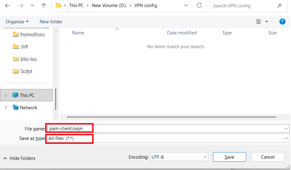 2. Tại trường File name (Tên tệp): Nhập tên bạn muốn kèm theo đuôi .ovpn (Ví dụ: pam-client.ovpn).